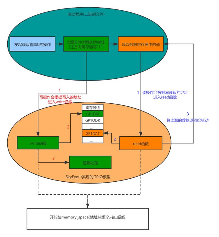 如某一时刻需要从GPIO的某一管脚读取数据,首先需要在驱动中设置GPIO方向寄存器为输出,然后再经过中断等其他操作从该管脚读取数据。设置GPIO方向为输出,相当于往该寄存器中某一个管脚位写“1”。写入1的这个过程可以被SkyEye的模型所获取,模型再根据写入的值实现相应的逻辑。之后驱动再发起读操作读取数据,该过程与写操作类似。整个过程可以参考图1-2-2:
