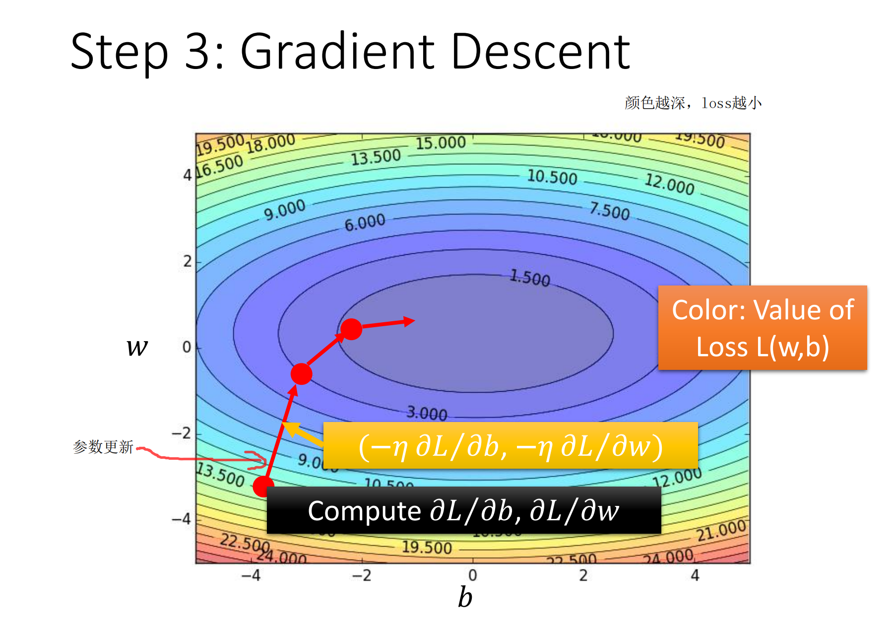 #     w = w - lr * w_gradb = b - lr/np.sqrt(lr_b) * b_gradw = w - lr/np.sqrt(lr_w) * w_grad# Store parameters for plotingb_history.append(b)w_history.append(w)# plot the figure