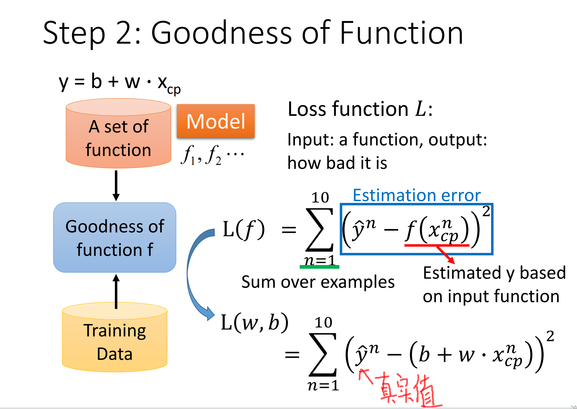 for i in range(iteration):b_grad = 0.0w_grad = 0.0for n in range(len(x_data)):b_grad = b_grad - 2.0*(y_data[n] - b- w*x_data[n])*1.0w_grad = w_grad - 2.0*(y_data[n] - b- w*x_data[n])*x_data[n]lr_b = lr_b + b_grad**2lr_w = lr_w + w_grad**2# Update  parameters