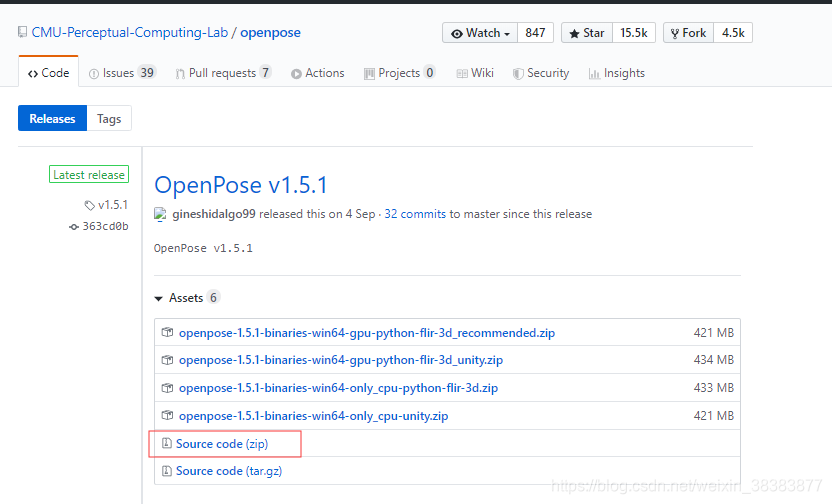 (2)下载openpose release版 1.5 选择Source code下载。(如果下载不下来就转存在码云中,然后直接下载,快很多)