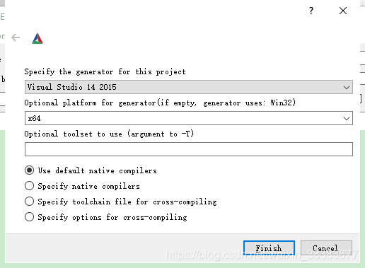 (2)点击configuration时,出现如下界面,选择:visual Studio 14 2015,x64,其余默认,点击finish