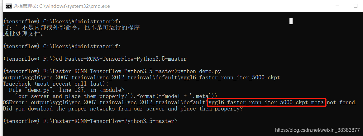这个地方入坑很久,下载的vgg16模型里就是没有这个文件的,查了好久才知道,这应该是新版TensorFlow模型训练时候产生的文件。作者没有提供,没有办法,只有自己训练。通过上一步的训练能够得到模型。把这些模型都放在这个output\vgg16\voc_2007_trainval+voc_2012_trainval\default路径下。out目录跟demo.py同目录。