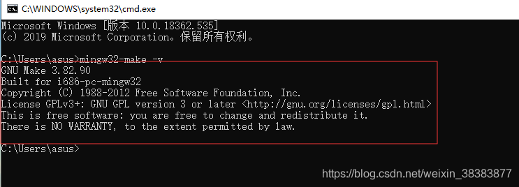 在cmd里输入:mingw32-make -v,如果出现如下信息,就说明安装成功了。