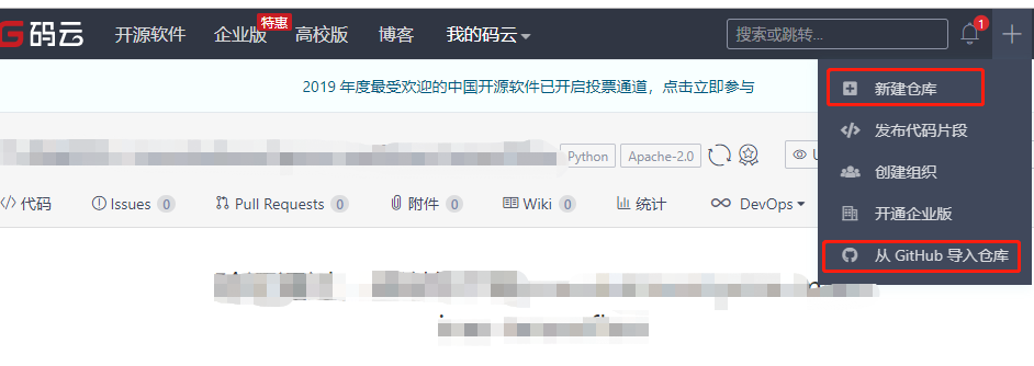 2、注册码云。新建仓库,从github中导入项目