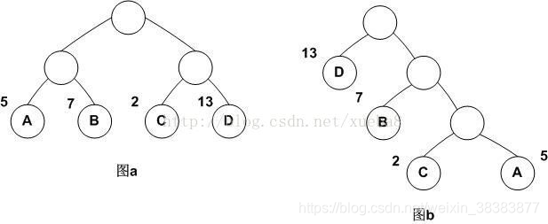 可见,图b的带权路径长度较小,我们可以证明图b就是哈夫曼树(也称为最优二叉树)。