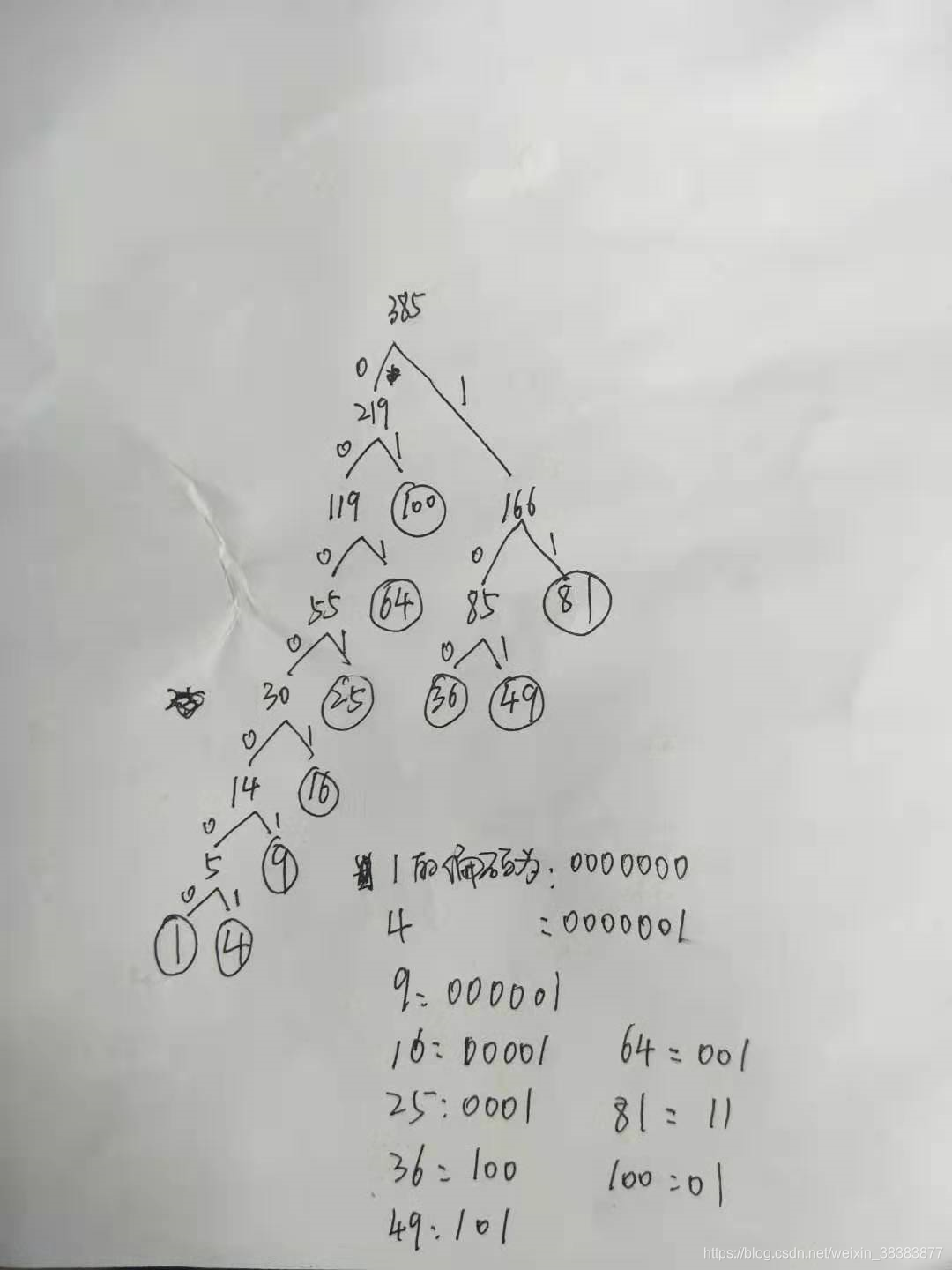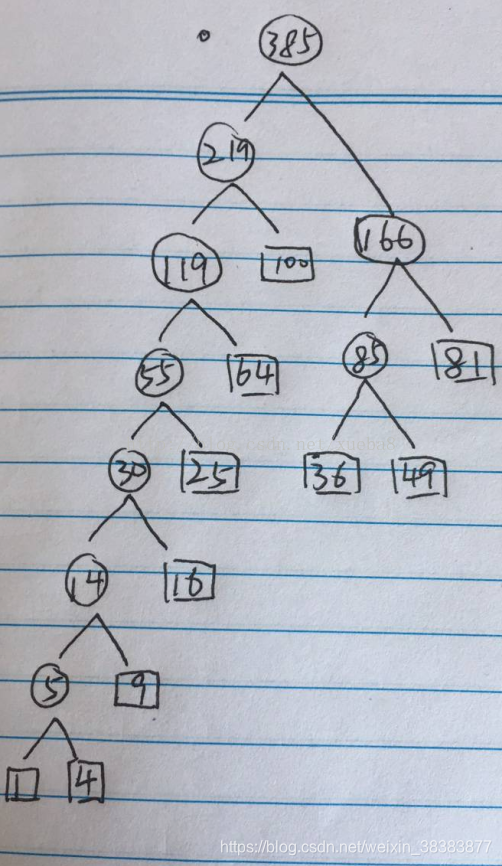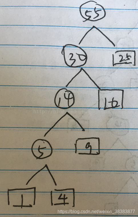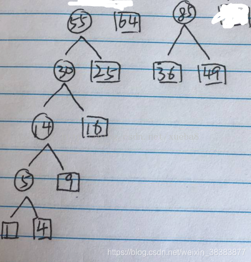 2、在这些数中 选择两个最小的数字(哈夫曼树是从下往上排列的)写在纸上。如下图所示