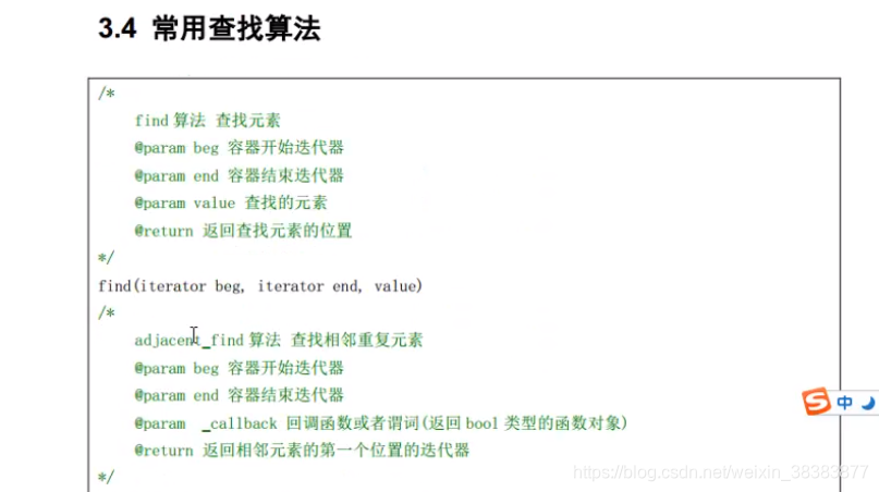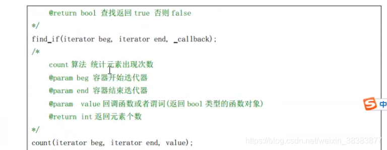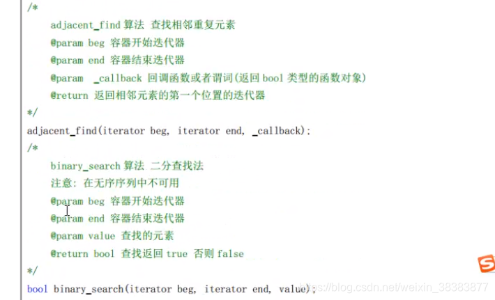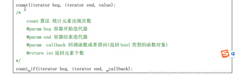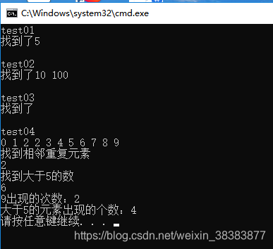 void test04() {vector<int> v1;for (int i = 0; i < 10; i++) {v1.push_back(i);}v1.push_back(2);sort(v1.begin(), v1.end());for (int i = 0; i < v1.size(); i++) {cout << v1[i] << " ";}cout << endl;vector<int>::iterator ret=adjacent_find(v1.begin(), v1.end());if (ret != v1.end()) {cout << "找到相邻重复元素" << endl;cout << *ret << endl;}else {cout << "没有找到相邻重复元素" << endl;}//find_if 会根据条件(函数)  返回第一个 满足条件的迭代器ret=find_if(v1.begin(), v1.end(), MySearch);if (ret != v1.end()) {cout << "找到大于5的数" << endl;cout << *ret << endl;}else {cout << "没有找到大于5的数" << endl;}//count count_ifint num=count(v1.begin(), v1.end(), 2);cout << "9出现的次数:" << num << endl;num=count_if(v1.begin(), v1.end(), MyCount);cout << "大于5的元素出现的个数:" << num << endl;