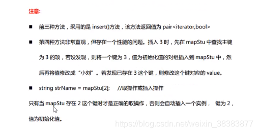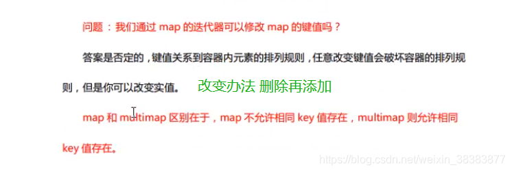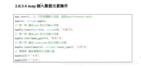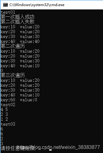 void test01() {//map容器参数 第一个参数key的类型 第二个参数value类型map<int, int> mymap;//插入元素 pair.first key值 pair.second value值//第一种初始化方法pair<map<int,int>::iterator,bool> ret=mymap.insert(pair<int, int>(10, 20)); //前三种都是这样:判断插入成功与否if (ret.second) {cout << "第一次插入成功" << endl;}elsecout << "第一次插入失败" << endl;ret = mymap.insert(pair<int, int>(10, 30));if (ret.second) {cout << "第二次插入成功" << endl;}elsecout << "第二次插入失败" << endl;//第二种初始化方法mymap.insert(make_pair(20, 20));//第三种初始化方法mymap.insert(map<int,int>::value_type(30, 30));//第四种初始化方法mymap[40] = 40;for (map<int,int>::iterator it=mymap.begin();it!=mymap.end();it++){//*it取出来的是一个paircout <<"key:" <<it->first << " value:"<<(*it).second << endl;}//此种方法//发现如果key不存在,创建pair插入到map容器中//如果发现key存在,那么会用新的value值替换原value值mymap[40] = 10;cout << "第二次遍历" << endl;for (map<int, int>::iterator it = mymap.begin(); it != mymap.end(); it++){//*it取出来的是一个paircout << "key:" << it->first << " value:" << (*it).second << endl;}//如果通过【】方式访问map中一个不存在的key,//那么map会将这个访问的key插入到map中,并且给value一个默认值cout << mymap[60] << endl;cout << "第三次遍历" << endl;for (map<int, int>::iterator it = mymap.begin(); it != mymap.end(); it++){//*it取出来的是一个paircout << "key:" << it->first << " value:" << (*it).second << endl;}