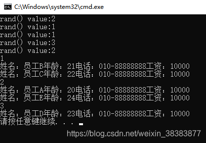 void ShowEmployee(multimap<int, Person> &mp) {ShowEmployeeByDepart(mp, SaleDepartment);ShowEmployeeByDepart(mp, FinanceDepartment);ShowEmployeeByDepart(mp, TechnologyDepartment);}void test01() {vector<Person> vp;CreateEmployee(vp);multimap<int, Person> mp;AssignDepartment(mp, vp);ShowEmployee(mp);