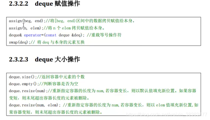 void test02() {deque<int> d1;deque<int> d2,d3,d4;d1.assign(10, 5);d4.assign(10, 4);d2.assign(d1.begin(), d1.end()); //迭代器指定区间赋值d3 = d2; //等号赋值cout << "未交换前的d1和d4:" << endl;PrintDeque(d1);PrintDeque(d4);swap(d1, d4);cout << "交换后的d1和d4:" << endl;PrintDeque(d1);PrintDeque(d4);if (d1.empty())cout << "d1 is empty!" << endl;elsecout << "d1 is not empty!" << endl;d1.resize(5); //后5个元素扔掉PrintDeque(d1);d1.resize(8); //以默认值填充新位置PrintDeque(d1);d1.resize(10, 88); //容器变长,以88进行填充PrintDeque(d1);}