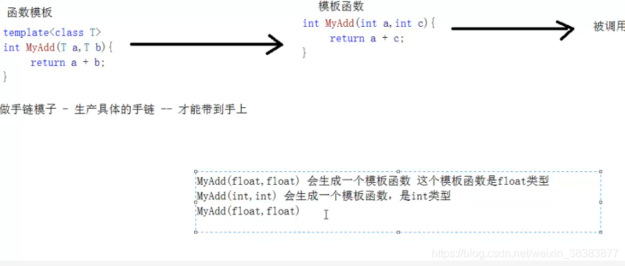 {int a = 10, b = 20;MyAdd(a, b); //产生MyAdd(int a,int b)函数并调用double da = 1.12, db = 1.14;MyAdd(da,db); //产生MyAdd(double a,double b)函数并调用MyAdd(a, a); //直接调用第一次产生的MyAdd(int a,int b)函数return 0;