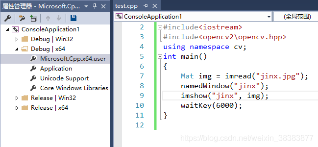 2、选择菜单---视图---属性管理器,VS里会出现属性管理器工作区。单击属性管理工作区,选择HelloOpenCV---debug | x64--- Microsoft.Cpp.x64.user,右击选择属性。