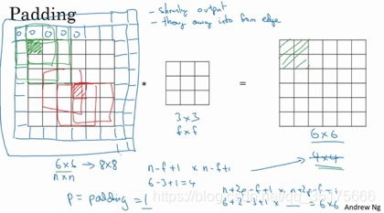 字面意思是填充,如果不做填充,那么6*6的图片经过3*3的卷积核处理后,大小变为f-n+1=4*4。