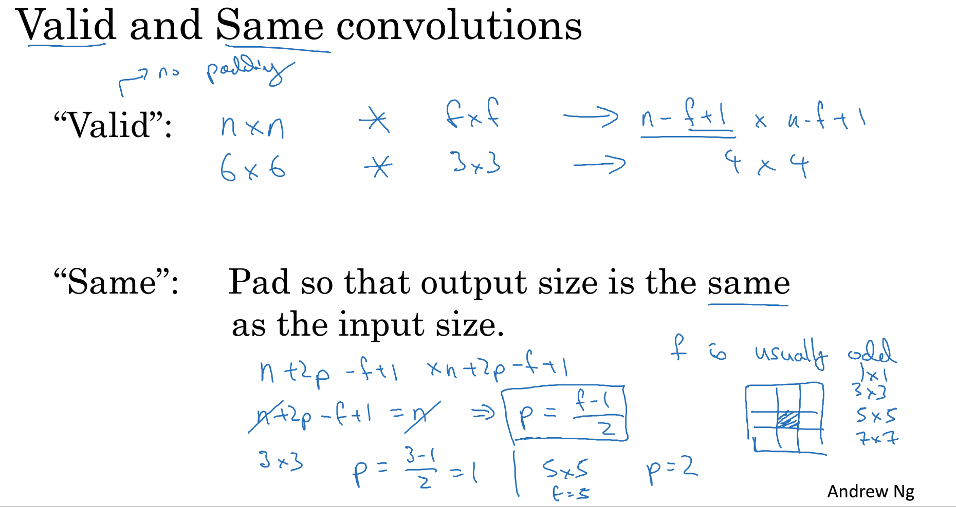 原始大小n, 卷积核大小f,padding是p,那么n-f+1+2p=n,求出p。