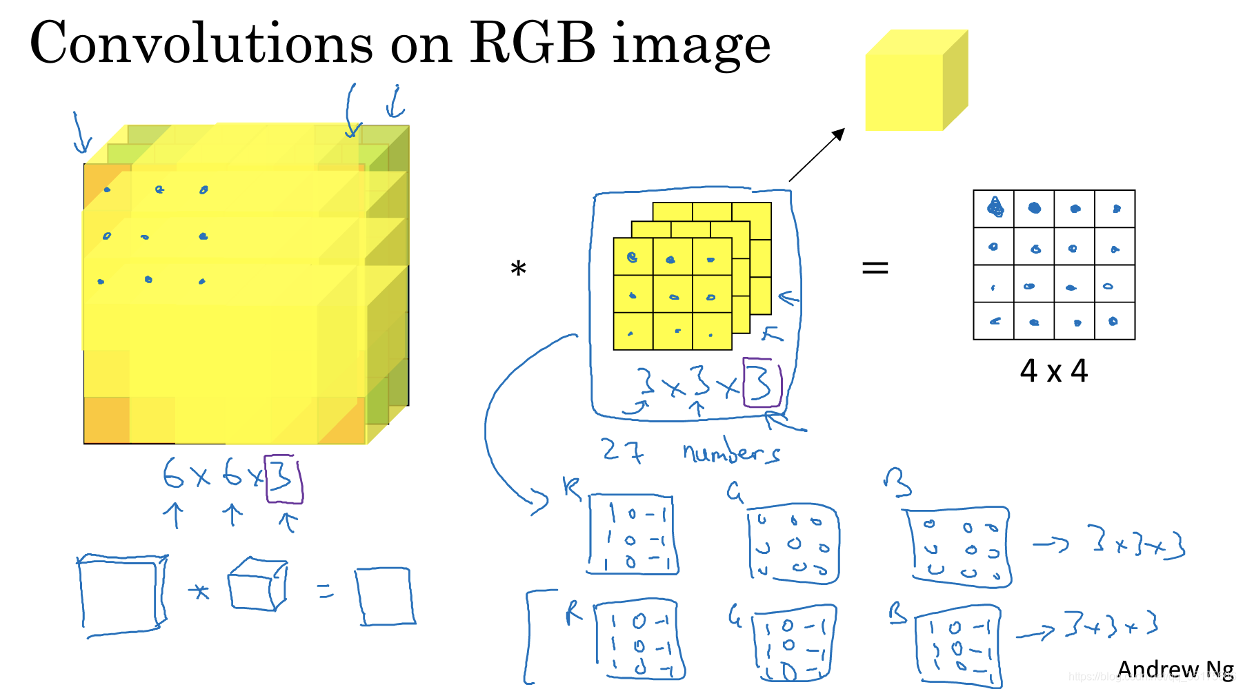 3个通道(立方体的深度为3)的原图像,卷积核是3*3*3的小立方体。