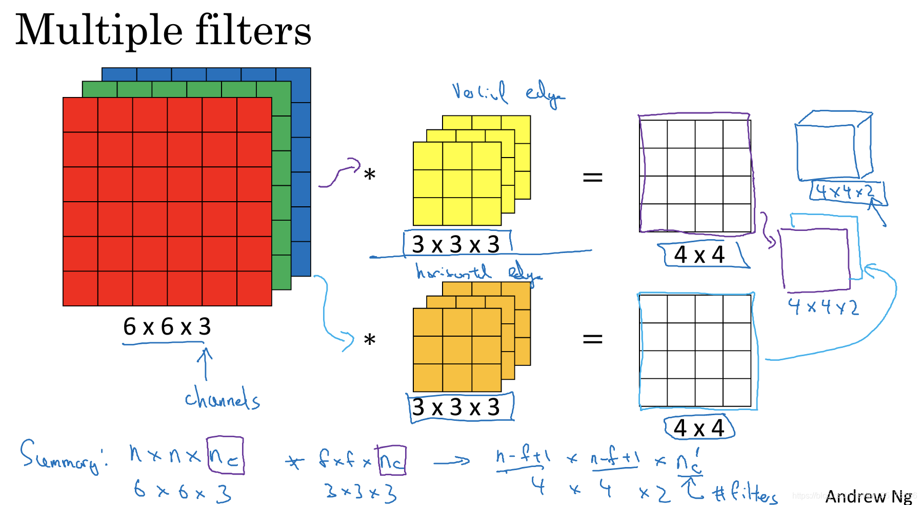 如果想同时探测竖直方向的线和水平方向的线,那么可以设计两个卷积核。每个卷积核分别去做运算,最后得到4*4*2的结果。