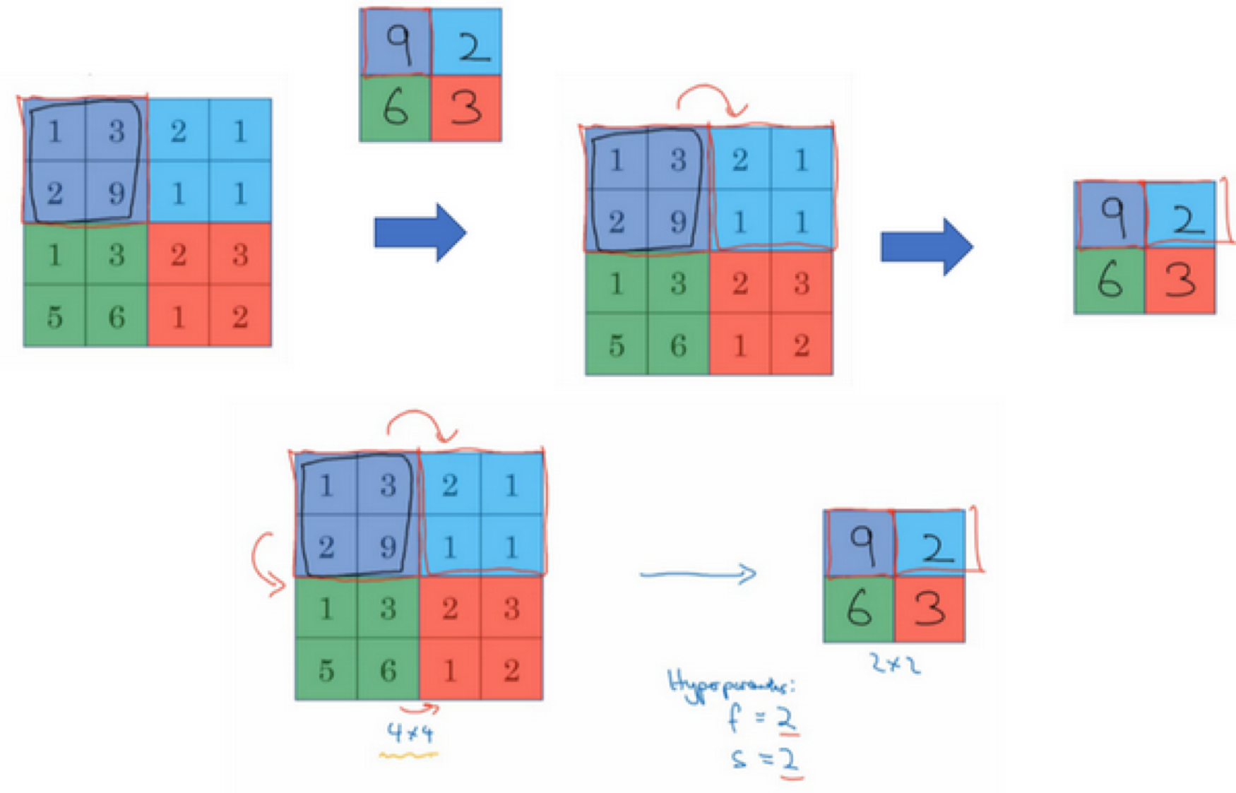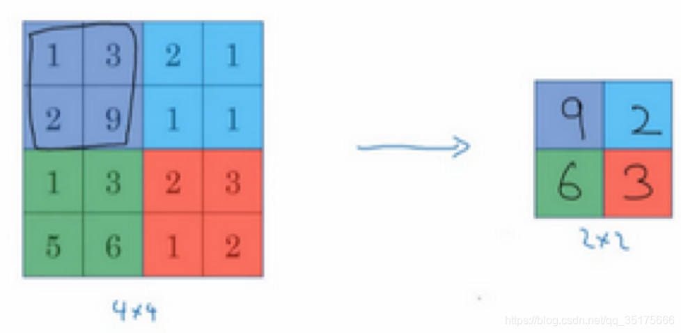 如下图,是最大池化。相同颜色的四个数字中 取最大值。