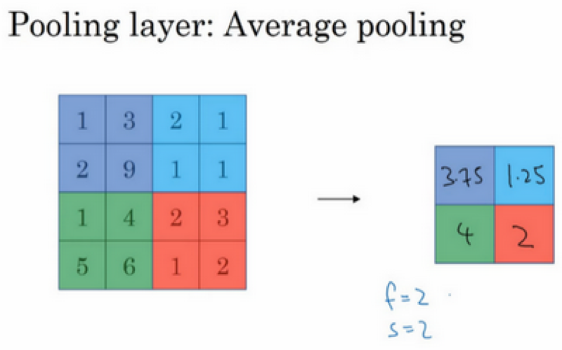 目前来说,最大池化比平均池化更常用。但也有例外,就是深度很深的神经网络,你可以用平均池化来分解规模为7×7×1000的网络的表示层,在整个空间内求平均值,得到1×1×1000,一会我们看个例子。但在神经网络中,最大池化要比平均池化用得更多