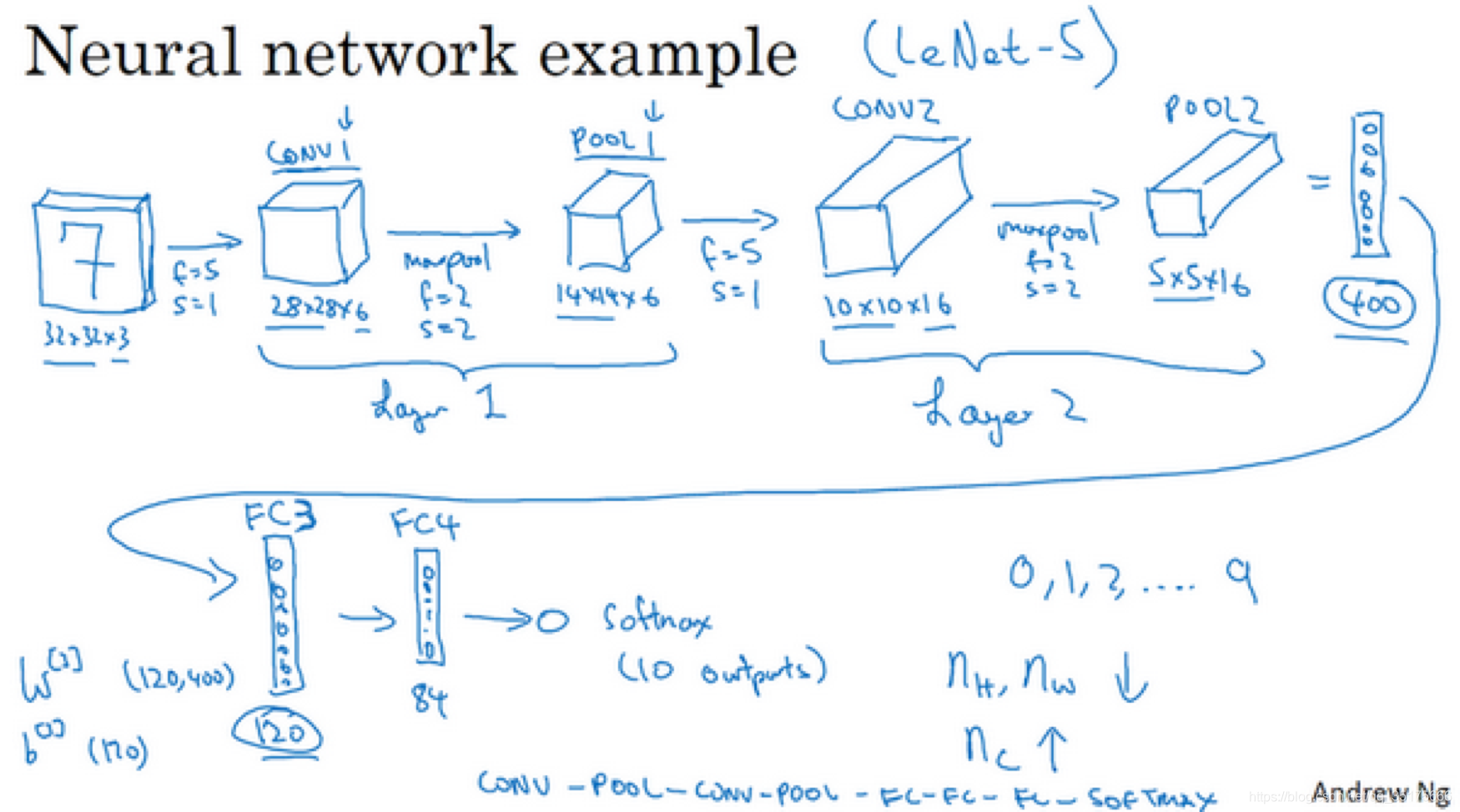 一个卷积层,跟着一个池化层。然后再卷积,再池化,这样输出的宽度和高度都逐渐减小,通道数逐渐增加。然后再到全连接层,全连接就是之前讲过的普通神经网络,参数数量是400*120,然后再跟着一个神经元数量更少的全连接层,最后通过softmax输出。