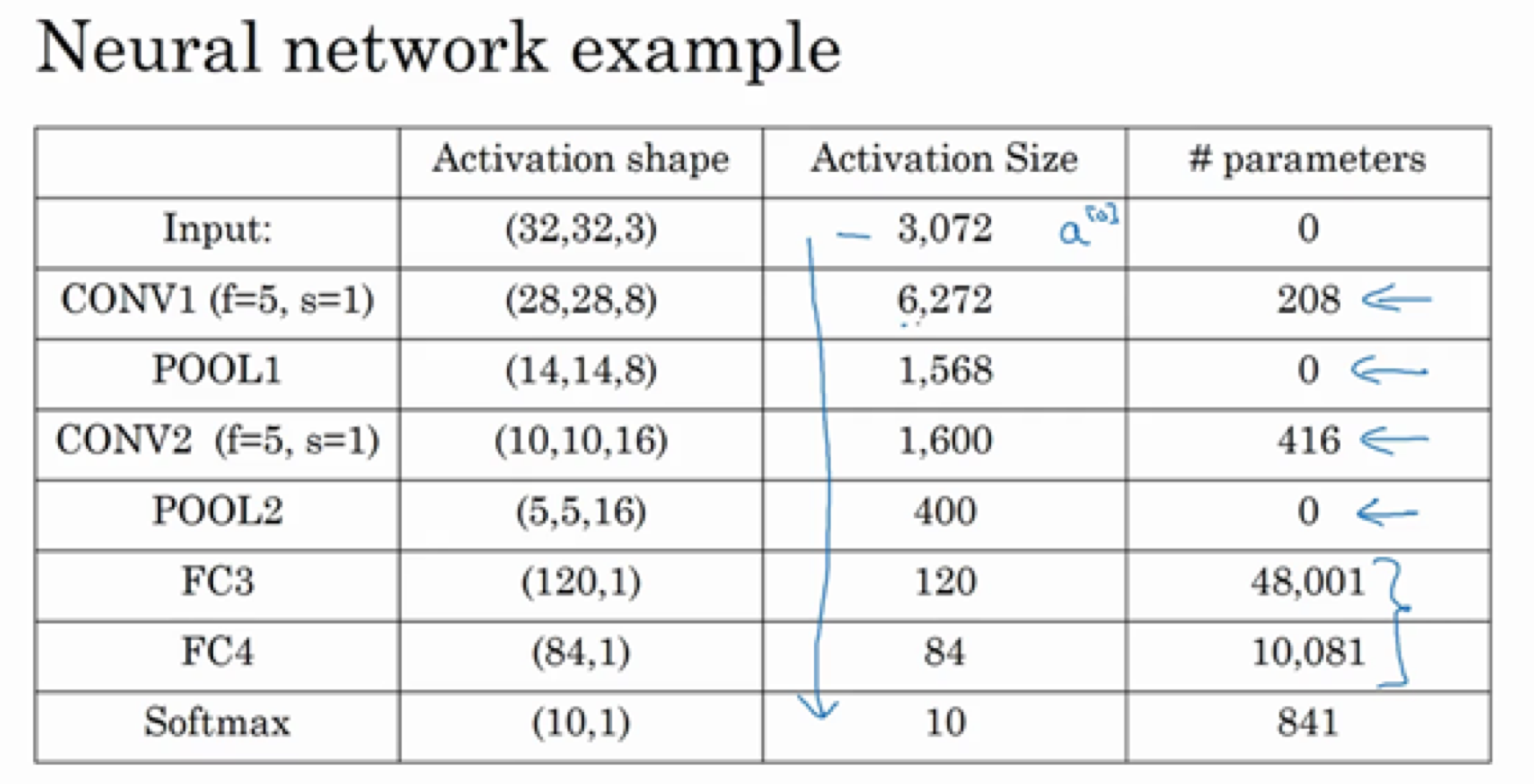接下来我们讲讲神经网络的激活值形状,激活值大小和参数数量。输入为32×32×3,这些数做乘法,结果为3072,所以激活值有3072维,激活值矩阵为32×32×3,输入层没有参数。计算其他层的时候,试着自己计算出激活值,这些都是网络中不同层的激活值形状和激活值大小。