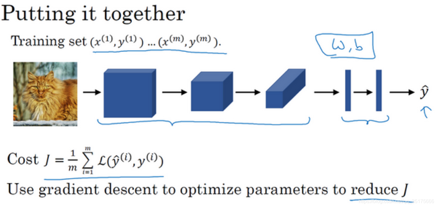 最后,我们把这些层整合起来,看看如何训练这些网络。比如我们要构建一个猫咪检测器,我们有下面这个标记训练集,表示一张图片,是二进制标记或某个重要标记。我们选定了一个卷积神经网络,输入图片,增加卷积层和池化层,然后添加全连接层,最后输出一个softmax,即。卷积层和全连接层有不同的参数和偏差,我们可以用任何参数集合来定义代价函数。一个类似于我们之前讲过的那种代价函数,并随机初始化其参数和,代价函数等于神经网络对整个训练集的预测的损失总和再除以(即)。所以训练神经网络,你要做的就是使用梯度下降法,或其它算法,例如Momentum梯度下降法,含RMSProp或其它因子的梯度下降来优化神经网络中所有参数,以减少代价函数的值。通过上述操作你可以构建一个高效的猫咪检测器或其它检测器。