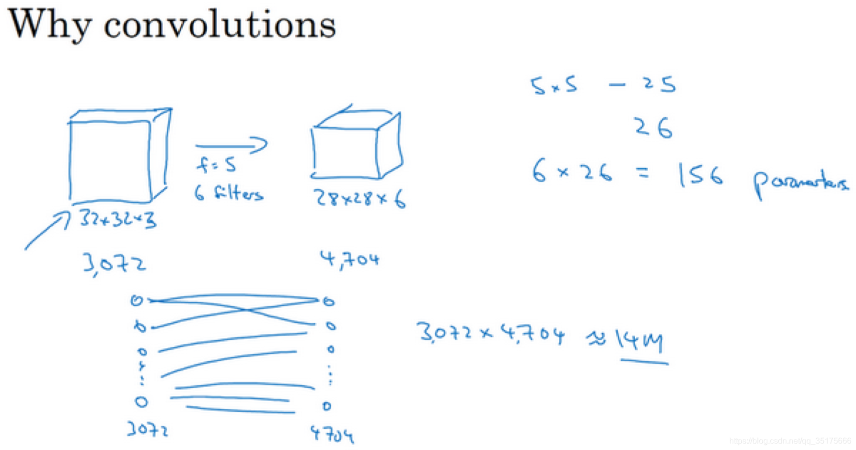 假设有一张32×32×3维度的图片,这是上节课的示例,假设用了6个大小为5×5的过滤器,输出维度为28×28×6。32×32×3=3072,28×28×6=4704。我们构建一个神经网络,其中一层含有3072个单元,下一层含有4074个单元,两层中的每个神经元彼此相连,然后计算权重矩阵,它等于4074×3072≈1400万,所以要训练的参数很多。虽然以现在的技术,我们可以用1400多万个参数来训练网络,因为这张32×32×3的图片非常小,训练这么多参数没有问题。如果这是一张1000×1000的图片,权重矩阵会变得非常大。我们看看这个卷积层的参数数量,每个过滤器都是5×5,一个过滤器有25个参数,再加上偏差参数,那么每个过滤器就有26个参数,一共有6个过滤器,所以参数共计156个,参数数量还是很少。