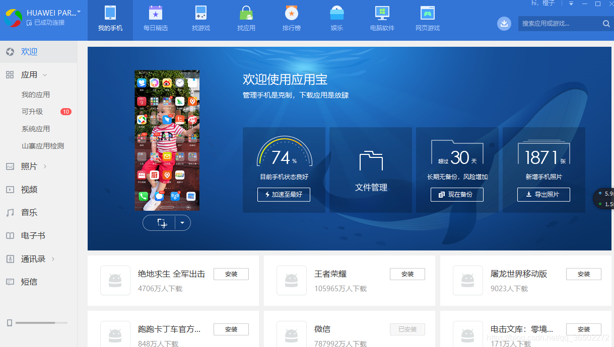 3、电脑和手机开启应用宝确认是否连接上,如下图说明已连上