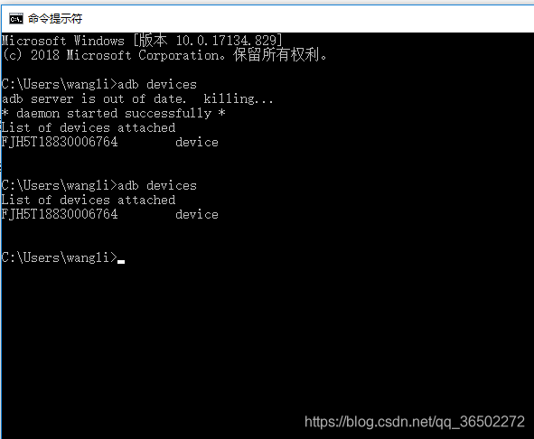 4、或cmd下adb devices确认下是否连接上,如下图说明已连上