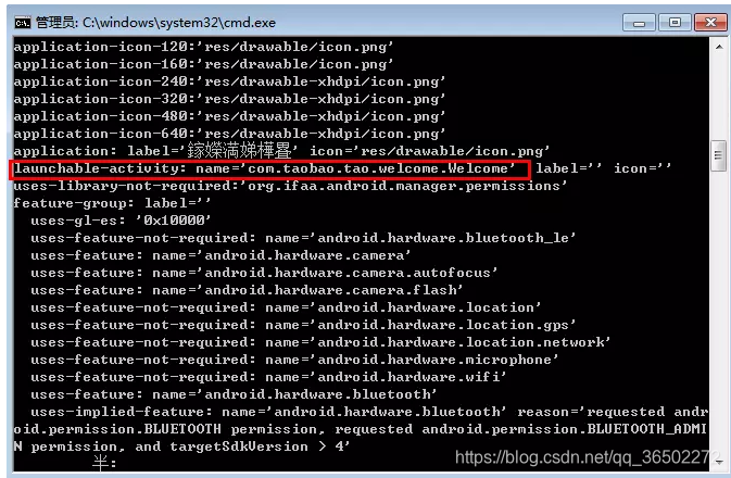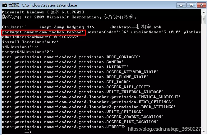 打开cmd,输入指令aapt dump badging D:\test\xxx.apk(APK的全名,如手机淘宝.apk)
