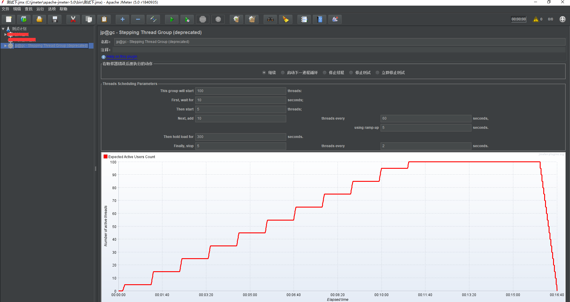 12、then hold load for:线程全部加载完之后运行多长时间,如图:设置为300秒,表示最后20000个线程加载完之后再持续300秒
