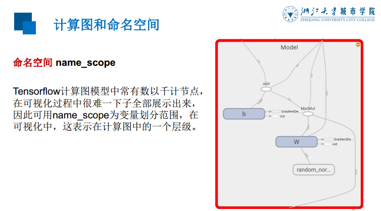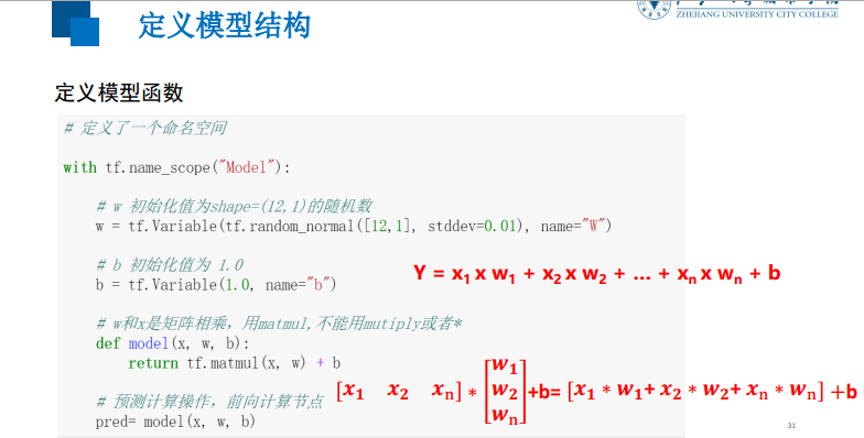 with tf.name_scope("Model"):# w 初始化值为shape=(12,1)的随机数w=tf.Variable(tf.random_normal([12,1],stddev=0.01),name="W") # 列向量 标准差为0。01# b 初始值为1.0b=tf.Variable(1.0,name="b")# w和x是矩阵叉乘,用matmul def model(x,w,b):return tf.matmul(x,w)+b# 预测计算操作,前向计算节点pred=model(x,w,b)### 训练模型# 迭代次数