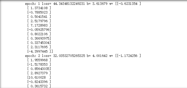 for epoch in range(train_epochs):loss_sum=0for xs,ys in zip(x_data,y_data):xs=xs.reshape(1,12)ys=ys.reshape(1,1)_,loss=sess.run([optimizer,loss_function],feed_dict={x:xs,y:ys})loss_sum=loss_sum+lossloss_list.append(loss)# 打乱数据顺序xvalues,yvalues=shuffle(x_data,y_data)b0temp=b.eval(session=sess)w0temp=w.eval(session=sess)loss_average=loss_sum/len(y_data)print("epoch:",epoch+1,"loss=",loss_average,"b=",b0temp,"w=",w0temp)