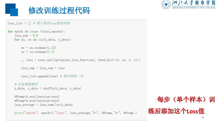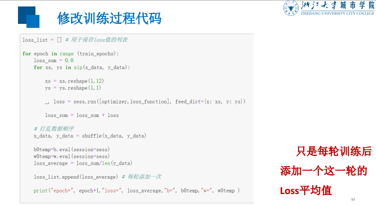 for epoch in range(train_epochs):loss_sum=0for xs,ys in zip(x_data,y_data):xs=xs.reshape(1,12)ys=ys.reshape(1,1)_,summary_str,loss=sess.run([optimizer,sum_loss_op,loss_function],feed_dict={x:xs,y:ys})writer.add_summary(summary_str,epoch)loss_sum=loss_sum+lossloss_list.append(loss)# 打乱数据顺序xvalues,yvalues=shuffle(x_data,y_data)b0temp=b.eval(session=sess)w0temp=w.eval(session=sess)loss_average=loss_sum/len(y_data)print("epoch:",epoch+1,"loss=",loss_average,"b=",b0temp,"w=",w0temp)