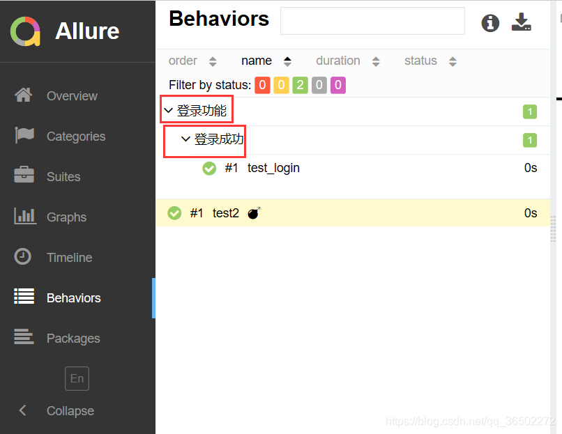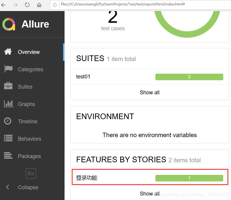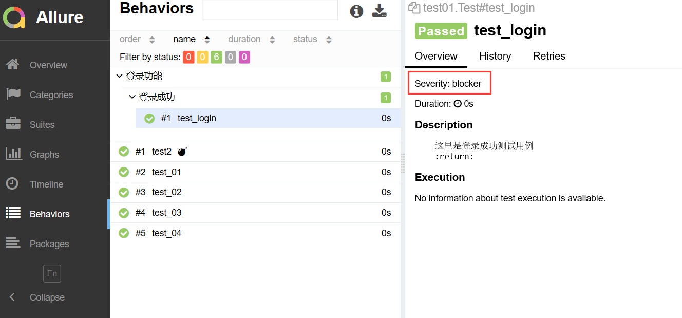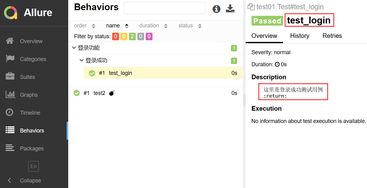 class Test(object):@allure.feature('登录功能')@allure.story('登录成功')def test_login(self):assert 1 == 1def test2(self):assert 1==1
