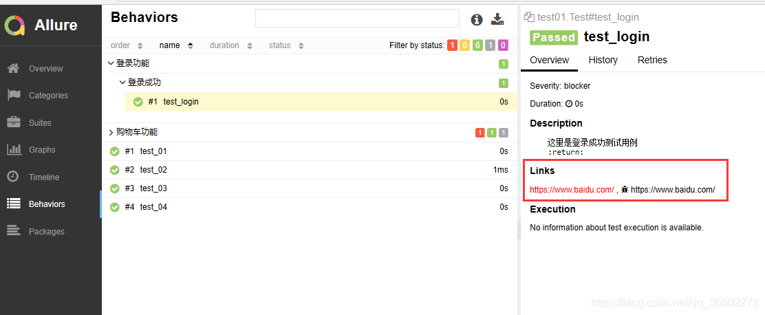 class Test(object):@allure.feature('登录功能')@allure.story('登录成功')@allure.severity('blocker')@allure.issue('https://www.baidu.com/')#添加缺陷对应链接@allure.testcase('https://www.baidu.com/')#添加用例对应链接def test_login(self):"""这里是登录成功测试用例:return:"""assert 1 == 1@allure.severity('critical')def test_01(self):assert 1==1@allure.severity('normal')def test_02(self):assert 1==1@allure.severity('minor')def test_03(self):assert 1==1@allure.severity('trivial')def test_04(self):assert 1==1if __name__=="__main__":#生成测试报告jsonpytest.main(["-s", "-q", '--alluredir', 'report/result', 'test01.py'])#将测试报告转为html格式split='allure '+'generate '+'./report/result '+'-o '+'./report/html '+'--clean'os.system('cd C:/Users/wangli/PycharmProjects/Test/test/report')os.system(split)print(split)"C:\Program Files\Python35\python.exe" C:/Users/wangli/PycharmProjects/Test/test/test01.py