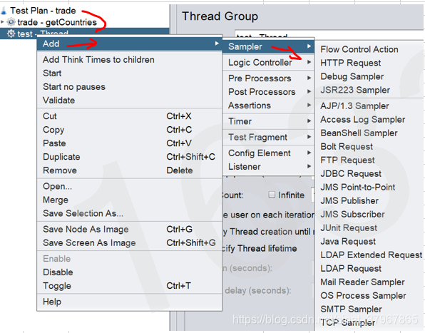 我们创建了线程组Thread Group后,会在它下面add组件Sampler取样器。