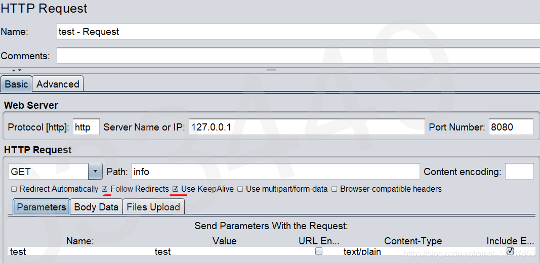 Redirect Automatically: 自动重定向,如果选中该项,发出的 http 请求得到响应是 301/302,jmeter 会重定向到新的界面