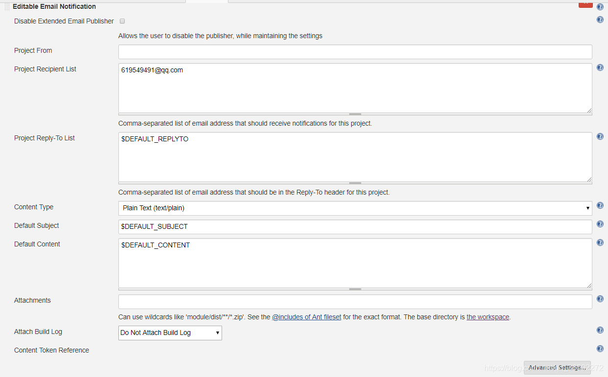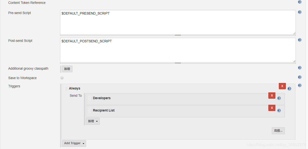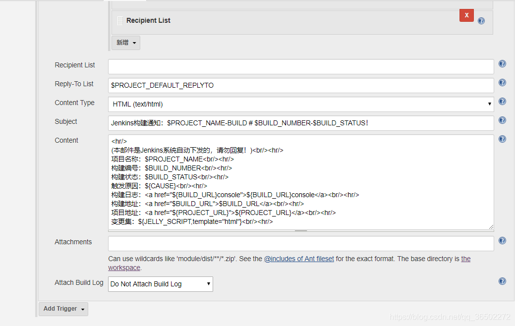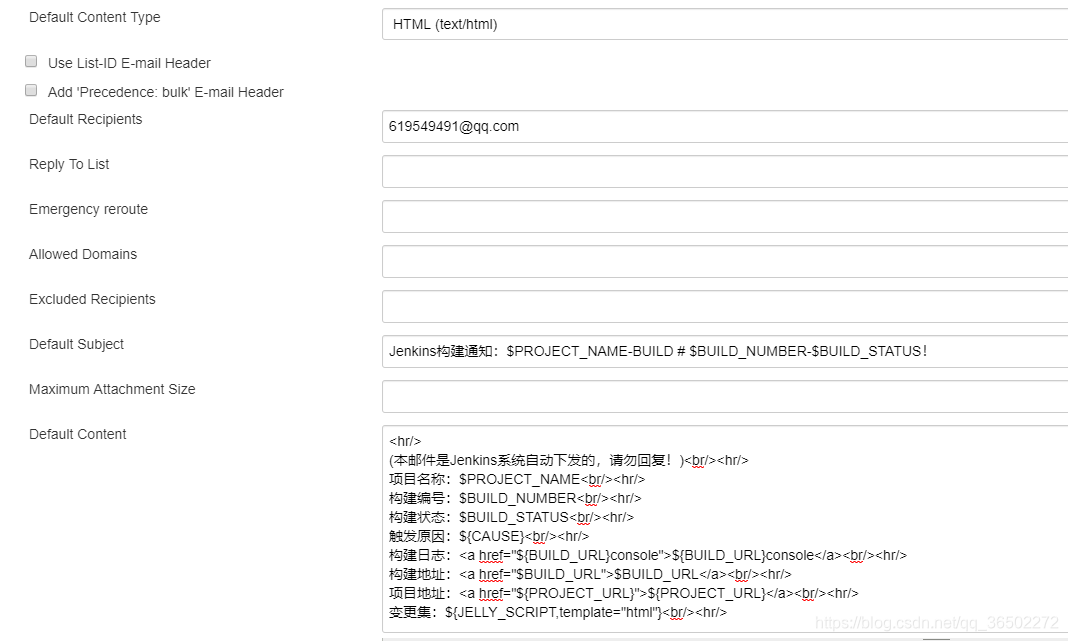 默然邮件标题Default Subject :Jenkins构建通知:$PROJECT_NAME-BUILD # $BUILD_NUMBER-$BUILD_STATUS!