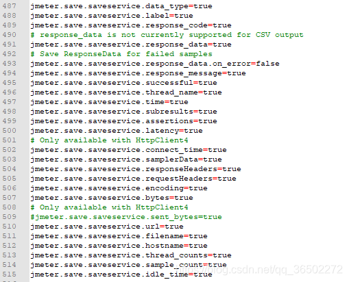 2、设置测试输出报告要输出的内容:同样在jmeter.properties中,设置需要输出的内容为true,并去掉前面的注释符号#,这里全部设置成true→保存