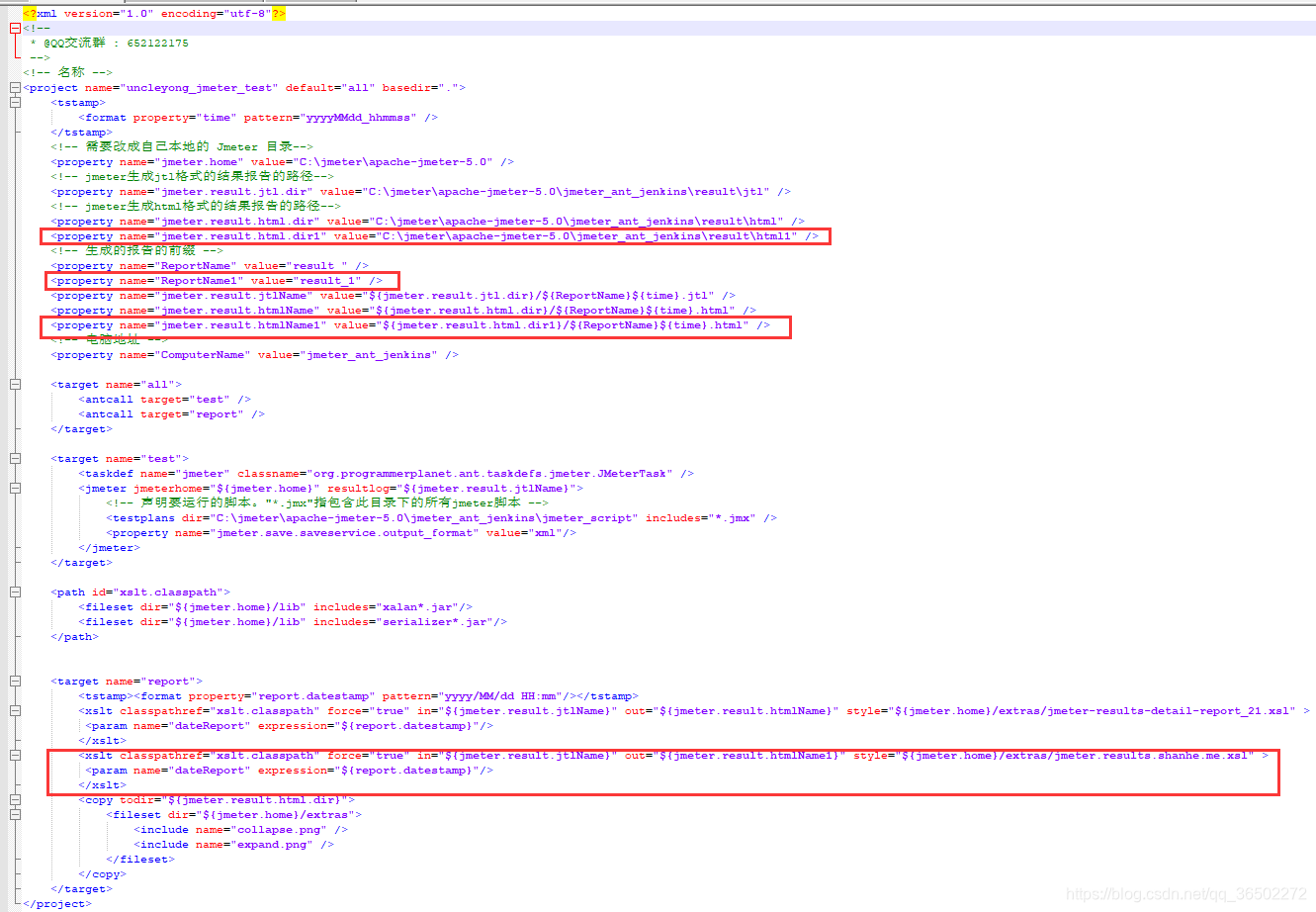 <project name="uncleyong_jmeter_test" default="all" basedir="."><tstamp><format property="time" pattern="yyyyMMdd_hhmmss" /></tstamp><!-- 需要改成自己本地的 Jmeter 目录--><property name="jmeter.home" value="C:\jmeter\apache-jmeter-5.0" /><!-- jmeter生成jtl格式的结果报告的路径--><property name="jmeter.result.jtl.dir" value="C:\jmeter\apache-jmeter-5.0\jmeter_ant_jenkins\result\jtl" /><!-- jmeter生成html格式的结果报告的路径--><property name="jmeter.result.html.dir" value="C:\jmeter\apache-jmeter-5.0\jmeter_ant_jenkins\result\html" /><property name="jmeter.result.html.dir1" value="C:\jmeter\apache-jmeter-5.0\jmeter_ant_jenkins\result\html1" /><!-- 生成的报告的前缀 --><property name="ReportName" value="result_" /><property name="ReportName1" value="result_1" /><property name="jmeter.result.jtlName" value="${jmeter.result.jtl.dir}/${ReportName}${time}.jtl" /><property name="jmeter.result.htmlName" value="${jmeter.result.html.dir}/${ReportName}${time}.html" /><property name="jmeter.result.htmlName1" value="${jmeter.result.html.dir1}/${ReportName}${time}.html" /><!-- 电脑地址 --><property name="ComputerName" value="jmeter_ant_jenkins" /><target name="all"><antcall target="test" /><antcall target="report" /></target><target name="test"><taskdef name="jmeter" classname="org.programmerplanet.ant.taskdefs.jmeter.JMeterTask" /><jmeter jmeterhome="${jmeter.home}" resultlog="${jmeter.result.jtlName}"><!-- 声明要运行的脚本。"*.jmx"指包含此目录下的所有jmeter脚本 --><testplans dir="C:\jmeter\apache-jmeter-5.0\jmeter_ant_jenkins\jmeter_script" includes="*.jmx" /><property name="jmeter.save.saveservice.output_format" value="xml"/></jmeter></target><path id="xslt.classpath"><fileset dir="${jmeter.home}/lib" includes="xalan*.jar"/><fileset dir="${jmeter.home}/lib" includes="serializer*.jar"/></path><target name="report"><tstamp><format property="report.datestamp" pattern="yyyy/MM/dd HH:mm"/></tstamp><xslt classpathref="xslt.classpath" force="true" in="${jmeter.result.jtlName}" out="${jmeter.result.htmlName}" style="${jmeter.home}/extras/jmeter-results-detail-report_21.xsl" ><param name="dateReport" expression="${report.datestamp}"/></xslt><xslt classpathref="xslt.classpath" force="true" in="${jmeter.result.jtlName}" out="${jmeter.result.htmlName1}" style="${jmeter.home}/extras/jmeter.results.shanhe.me.xsl" ><param name="dateReport" expression="${report.datestamp}"/></xslt><copy todir="${jmeter.result.html.dir}"><fileset dir="${jmeter.home}/extras"><include name="collapse.png" /><include name="expand.png" /></fileset></copy></target>