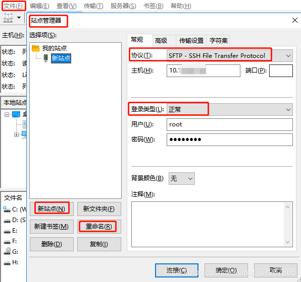 左边我的站点列表显示所有连接的服务器,我的站点下面是工具菜单,主要进行新建连接或者对连接重命名