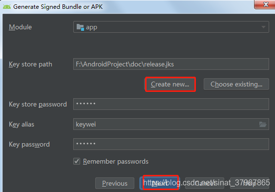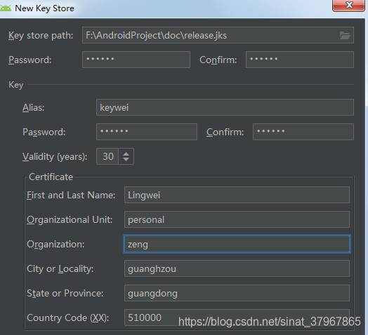 在Key store path中输入自己要用来进行签名的密钥文件的存放位置,同时输入密钥文件的读写用户名密码