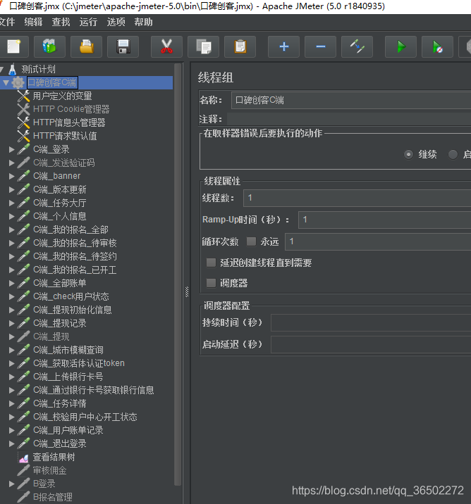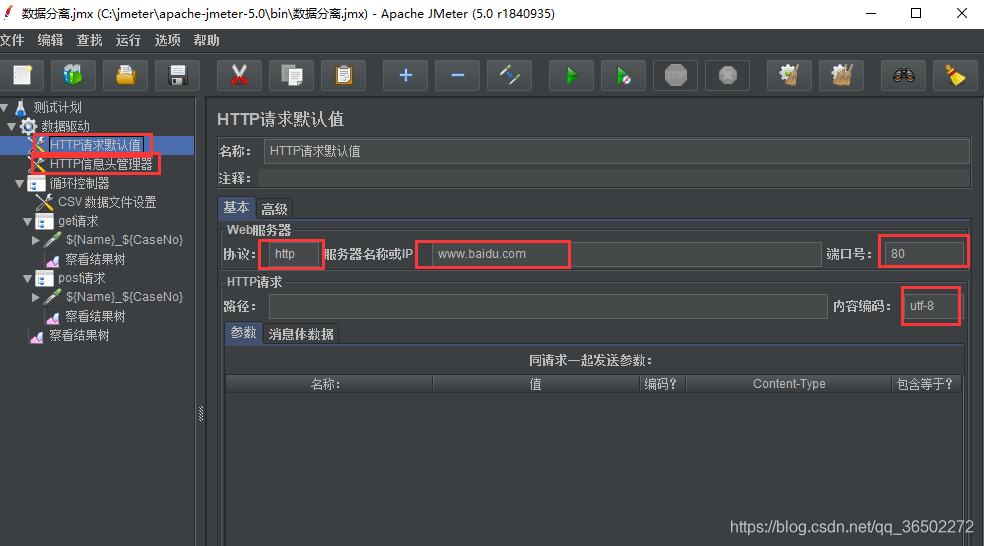 2、创建一个 HTTP请求默认值放域名、HTTP信息头管理器放头信息,供所有接口共用,如图:
