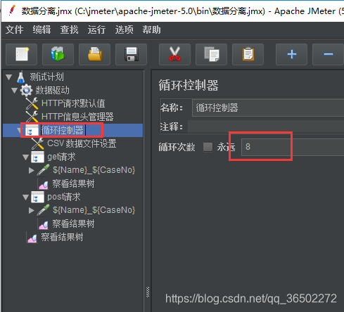 线程组——添加——逻辑控制器——循环控制器。 循环控制器的作用可以控制整个用例循环执行的次数。默认值是 1 根据用例数量可以修改为 8,循环8次