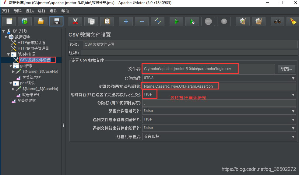 循环控制器—添加—CSV 数据文件设置,循环读取excel用例数据的每个字段,具体配置内容如下: