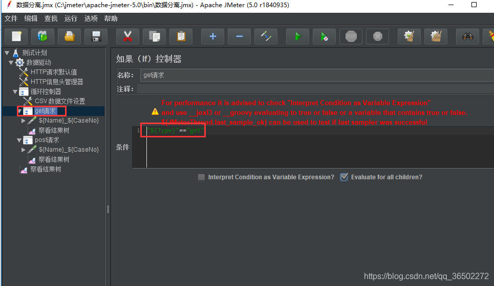 条件语句为:"${Type}"=="get"其中 ${Type}表示引用 csv 中的 Type中的值。