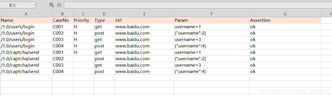 其实我们可以将用例的数据存放在 csv 文件中,然后通过 csv 文件配置来读取用例中的数据,执行测试。用例数据如下图所示: