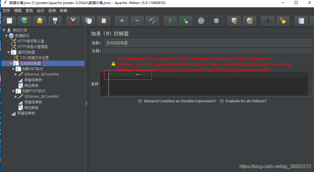 条件语句为:"${Priority}"=="H"其中 ${Priority}表示引用 csv 中的 Priority中的值。