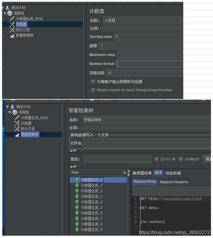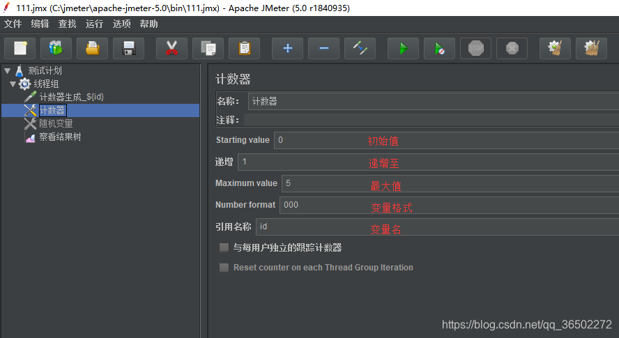 Reset counter on each Thread Group Iteration : 可选,仅勾选与每用户独立的跟踪计数器时可用,如果勾选了,每次线程组迭代,都会重置计数器的值。当线程组是在一个循环控制器内时比较有用