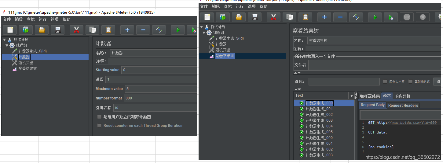 例1: 初始值0,递增值1,最大值5,,变量格式是000,生成变量为000 001 002 003 004 005,线程组设置并发或循环10次